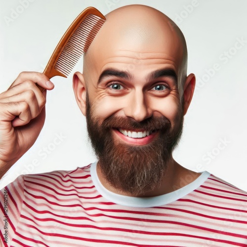 A bald funny man with a comb smiles. Hair loss concept isolated white background