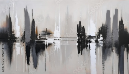monochrome abstract cityscape reflection, black and white modern skyline with vertical lines and blurred architectural forms