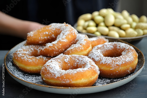 Świeżo usmażone pączki i faworki posypane cukrem oudrem na talerzu z bliska