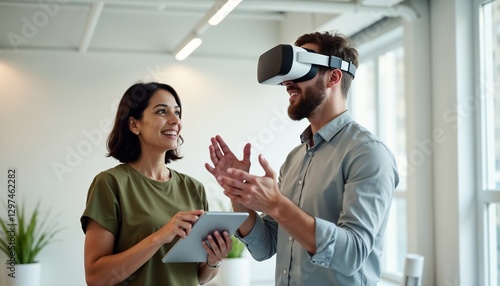 Man engaging with virtual reality technology while interacting with a tablet in an office. Highlighting technology, innovation, and collaboration, this image captures modern tools used in professional