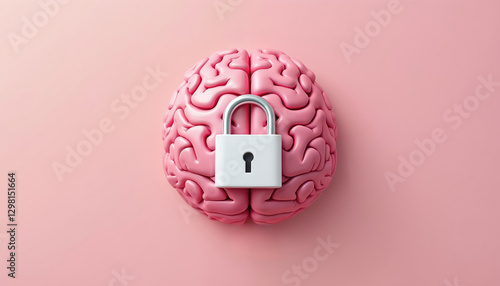 Pink brain with white padlock on pink background mental health protection, brain activity confinement, secure memory. Represents locked mind, locked consciousness, data encryption. Mental health