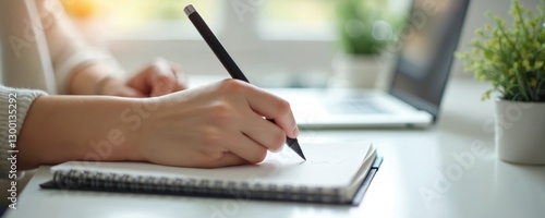 Asian woman takes notes in notebook. Studying online, remote working concept. Student writes with pen in notepad at home desk near laptop, plant. Learning and education.