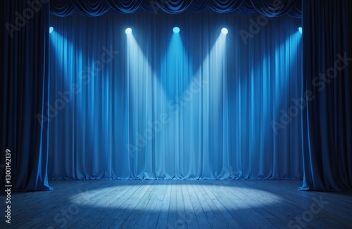 Empty stage with blue curtains illuminated by spotlights. Classic theatre interior with wooden floor, velvet drapes. Scene ready for ballet performance, dance show theatrical production. Elegant