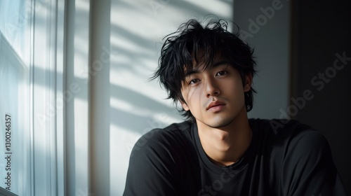 Portrait of a handsome Asian man in a black t-shirt by the window