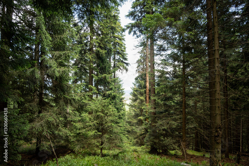 Tall pine and spruce trunks stretch skyward in a dark mountain forest. From below, their imposing silhouettes create a somber cathedral effect as branches merge into a dense green ceiling high above.