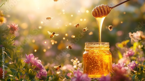 A spoonful of honey being poured into a jar, set against a blurred bee-themed natural background