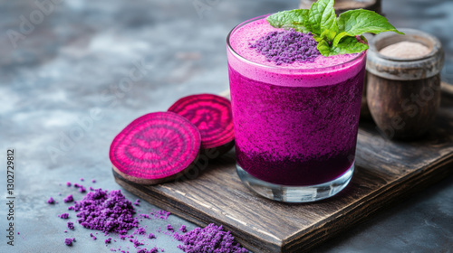 Super food powder, A vibrant purple drink infused with beetroot captured in high fidelity for stock image use.