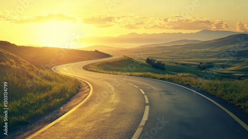 Sunrise Journey: A winding road disappears into a vibrant sunrise over rolling hills, symbolizing a path towards new beginnings and endless possibilities.