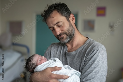 Father tenderly cradling his newborn child in his arms in the maternity ward