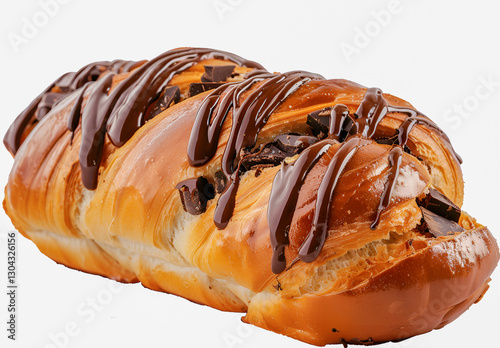 Słodka drożdżówka z czekoladą na białym tle – apetyczne ciasto z polewą i kawałkami czekolady, deser piekarniczy do promocji lub menu