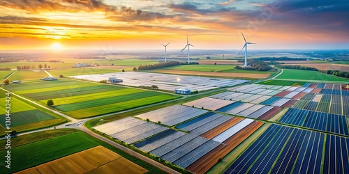 Aerial View: Sustainable Energy Grid in Dutch Landscape - Wind Turbines & Solar Panels