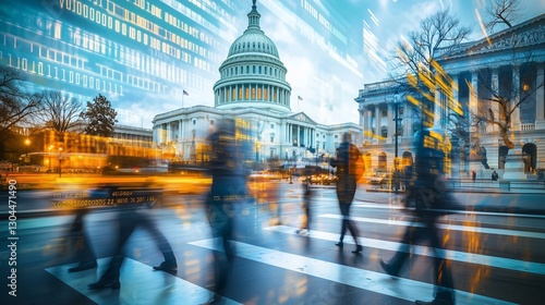 Blurred people and us capitol symbolize dynamic political shifts.