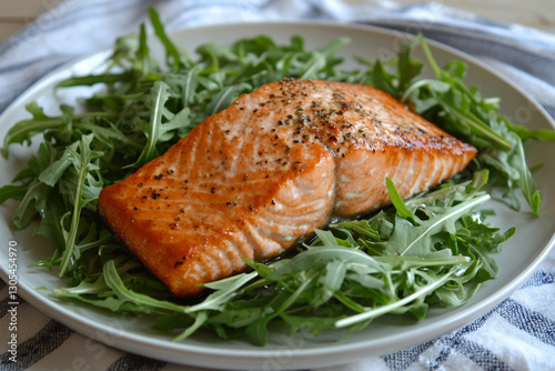 Generative AI image of a healthy salad with grilled fish and fresh green vegetables in a rustic bowl