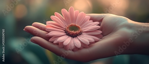 A delicate pink flower rests gently in an open palm, symbolizing nurturing and the beauty of nature's gifts.