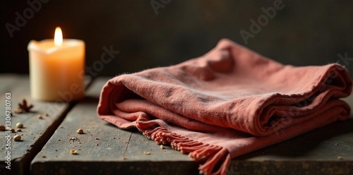 Folded piece of cloth on a wooden table with a candle, folk craft, handmade cloth, wooden table