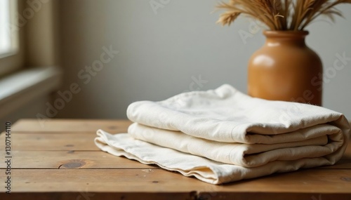 Folded piece of cloth on a wooden table with a vase, natural fiber, rustic decor