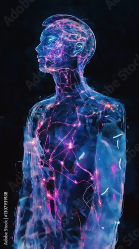 #1602311290Human body with glowing red pain points on neural pathways illustrating pain or nerve stimulation, set against a dark blue