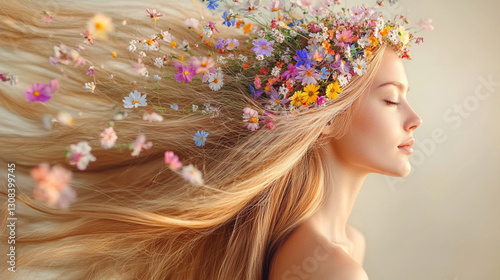 Kobieta blond włosy, z kwiatami we włosach, wiosenne tło dla projektu generative ai