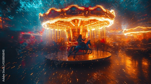 Person on a spinning carousel surrounded by swirling lights abstract shapes and vibrant colors representing the distorted perception during a psychedelic carnival ride