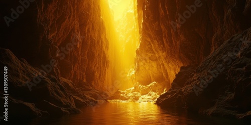 3d background minimalistic mockup with space for text, cinematic perspective of a narrow canyon with a hidden river glowing in golden light