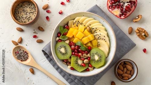 An overhead view of a bowl of exotic fruit salad with vibrant colors, perfect for healthy and fresh food themes