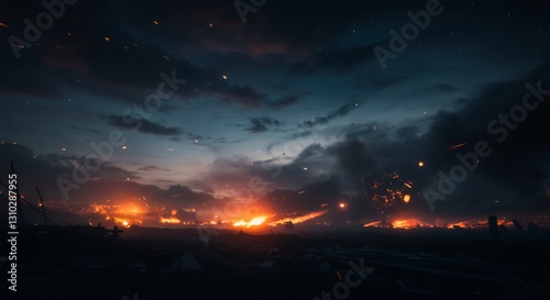Distant city lights glowing on horizon at night. Dark moody landscape with starry sky. Atmospheric nighttime scenery for book cover or wallpaper. Twilight cityscape.