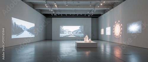 Contemporary art gallery with minimalist white walls and digital projections