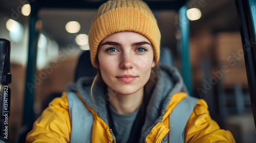 Young woman operating forklift, concentrating on logistics tasks inside industrial warehouse environment