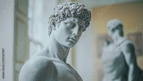 Ancient greek marble statue of a man in the museum, finely sculpted figure, with lifelike details in the muscles and facial expression