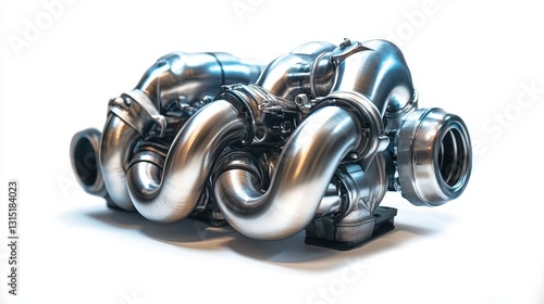 A close-up of a high-performance car engine exhaust manifold and turbocharger on a white isolated background
