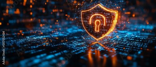 Cyber defense concept glowing digital shield with a metallic lock, defending data streams against cyber attacks, illuminated by binary code, ultradetailed, 8K photorealism