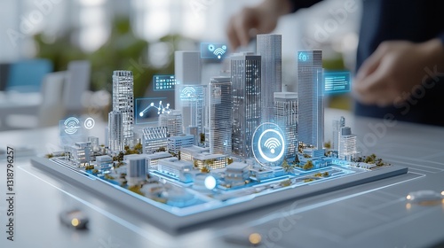 Sleek Silver Smart City Model with Futuristic Digital Visualization of an Ultra Modern Urban Landscape This image showcases a detailed 3D model of a futuristic city with advanced infrastructure