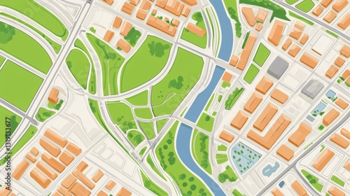Detailed close up illustration of an urban area map highlighting streets, parks, and landmarks