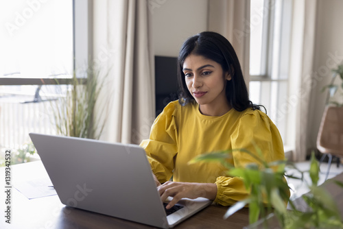 Young Indian woman browsing and purchasing services, or studying online, watching tutorials, writing business emails, responding to formal messages, lead digital communication in homeoffice use laptop