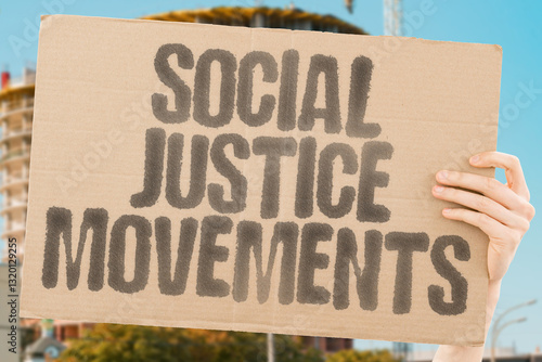 "Social justice movements" on worn cardboard. Highlights collective efforts to address unfairness and discrimination. ACTIVISM. PROTESTS. CHANGE. FAIRNESS. INCLUSION. DIVERSITY. ADVOCACY
