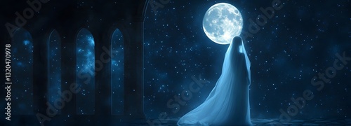 A ghostly woman in an ethereal gown floating through an ancient ruined cathedral under moonlight