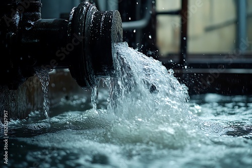 Water flows from a pipe into a reservoir, creating bubbles and ripples in a manufacturing setting