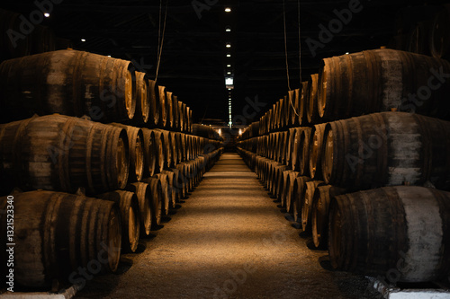 Rows of Wooden Barrel in a Wine Cellar