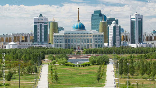 Panorama of the Astana city timelapse and the president's residence Akorda with park