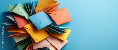 A pile of colorful paper envelopes with a blue background
