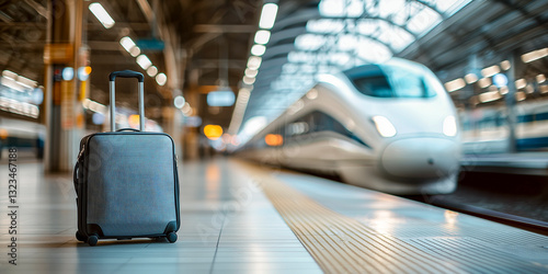 suitcase standing on a railway platform with a high-speed train arriving in background - travel, mobility and adventure concept