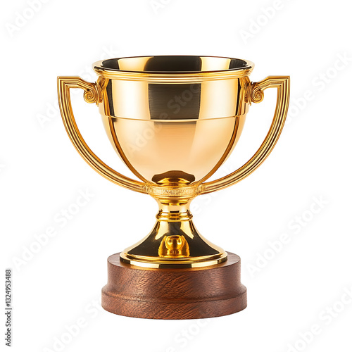 gold tropy cup with plain solid handles and a wooden base on an isolated white background