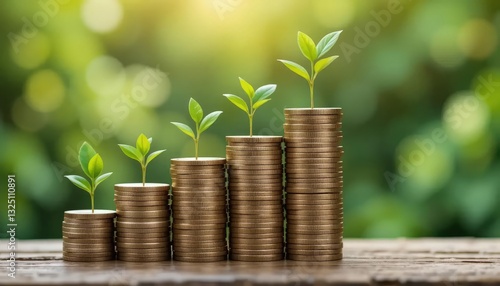 Stacks of coins with green plants symbolize financial growth and investment.