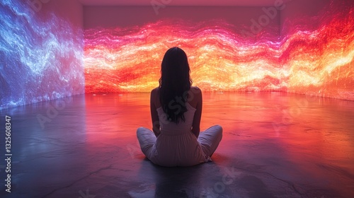 Woman meditates in a room with vibrant light projections.