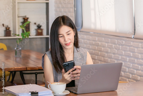 A focused woman engages with her smartphone in cafe coffee shop, exemplifying modern connectivity and relaxation, insurance agent waiting for customer using laptop for life planning calculation