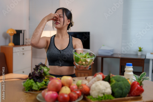 Young woman pinching her nose while holding a bowl of salad with disgust