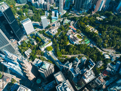 Aerial panorama of Hong Kong city showcasing skyscrapers, roads, and green spaces from a high vantage point. Urban cityscape with dense buildings and nature.