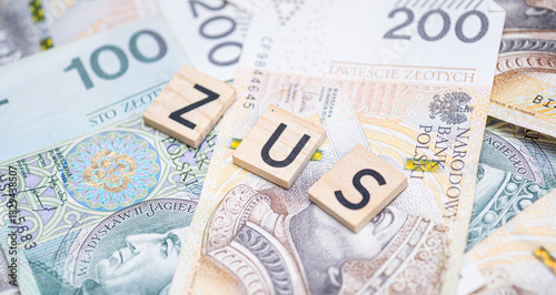 The word "ZUS" (Polish Social Insurance Institution) on a background of Polish banknotes, symbolizing social security, public funds, and financial obligations in Poland