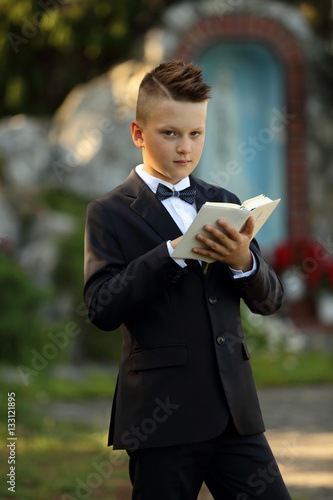 Pierwsza komunia, chłopiec w garniturze z książeczką na tle kapliczki.