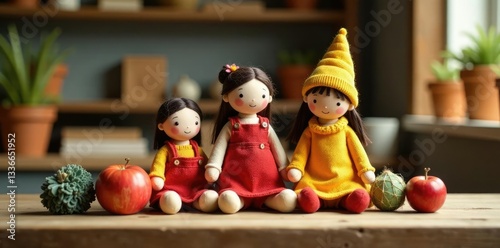 Dolls made of natural fibers on a wooden desk, natural fibers, table, hobby